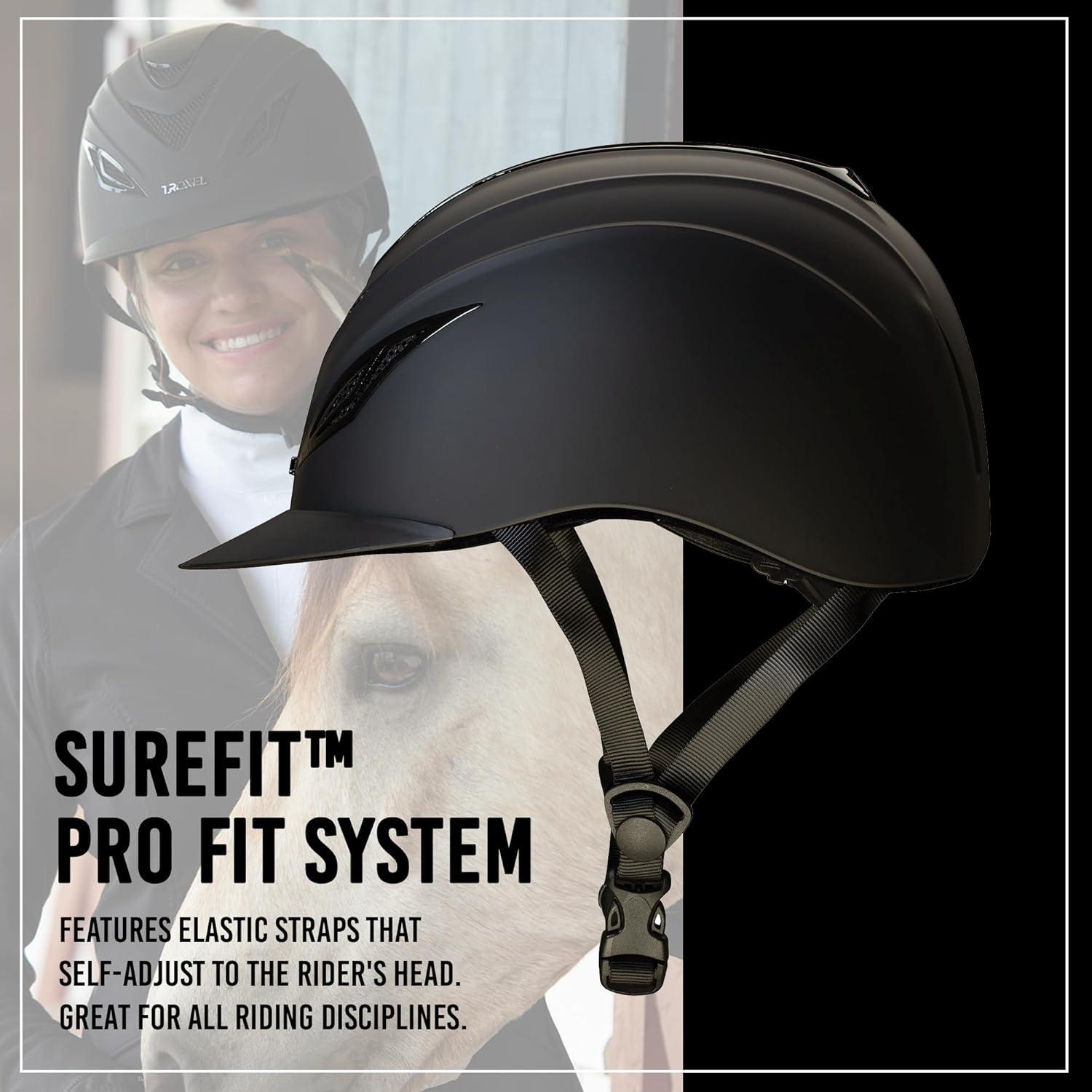 Low-Profile Design: This sleek, modern equestrian helmet is built to effortlessly adapt to a variety of head shapes; the self-adjustable horse helmet comes with a SureFit Pro fit system along with a new extended coverage FlexVisor