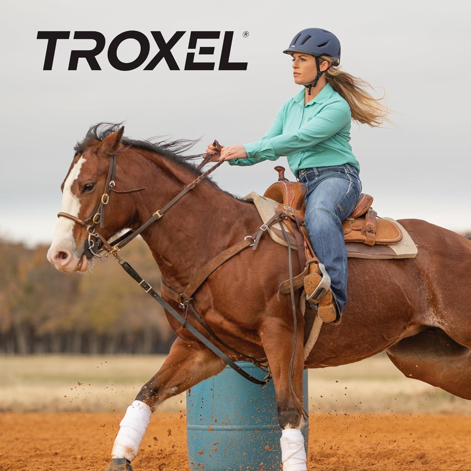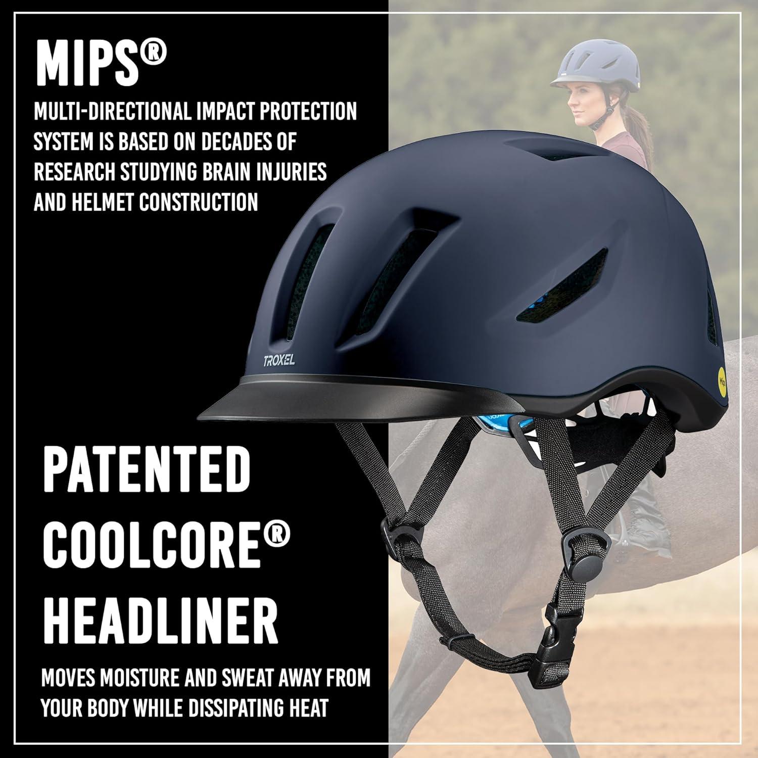 Troxel MIPS Horse Riding Helmet: Must-have equestrian gear for children and adults, competitive riders, equine enthusiasts, and a reliable accessory for riders of all experience levels. Our equestrian riding helmets come with the added protection of Multi-Directional Impact Protection System (MIPS) technology, a state-of-the-art protection system commonly used in helmets for horse riding, snowboarding, snow skiing, motorsports and rock climbing. This technology features a low-friction layer that allows multi-directional movements of 10-15 mm during impact. This reduces the rotational force to the rider’s head in case of a fall. Suitable to wear for daily rides, training sessions, events, racing, jumping, or equestrian sports. Designed to endure harsh riding conditions, this low-profile horse helmet offers incredible comfort and security. Unlike traditional riding helmets, our horse riding helmets for women, men, and children create the most comfortable fit for a variety of head shapes. Choose from a wide range of hues, finish, and sizes for a personalized look and fit. It is a great option for riders looking to match their horse's gear or boldly show off their sense of style! Available in small, medium, and large sizes, making it ideal helmet gear for every rider. The sturdy material of this horse accessory can stand up to the rigors of equestrian activity and is designed for long-lasting use. Our horseback riding helmets are an ideal gift for horse showmen and equine owners alike.